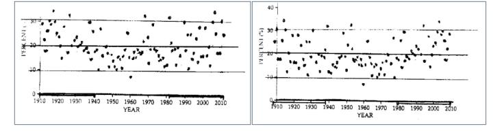 Die beiden Grafiken sind identisch, abgesehen davon, dass eine von links nach rechts seitenverkehrt, also rückwärts, dargestellt ist, wobei die Zeit nach links hin zunimmt. (Wenn man genau hinschaut, erkennt man, dass sie Spiegelbilder voneinander sind.) Ich behaupte: Wenn Sie nicht erkennen können, welche dieser Grafiken korrekt dargestellt ist und welche zeitlich rückwärts verläuft, dann lässt sich der von Lubchenco und Karl behauptete jüngste Anstieg der Häufigkeit extremer Wetterereignisse nicht eindeutig aus ihren Daten ableiten. Eine dieser Grafiken soll laut Lubchenco und Karl eine bevorstehende Klimakatastrophe vorhersagen! Sind Sie wirklich so zuversichtlich, dass Sie bereit wären, Billionen von Dollar darauf zu setzen, dass Sie erkennen können, welche Grafik diese Vorhersage trifft?